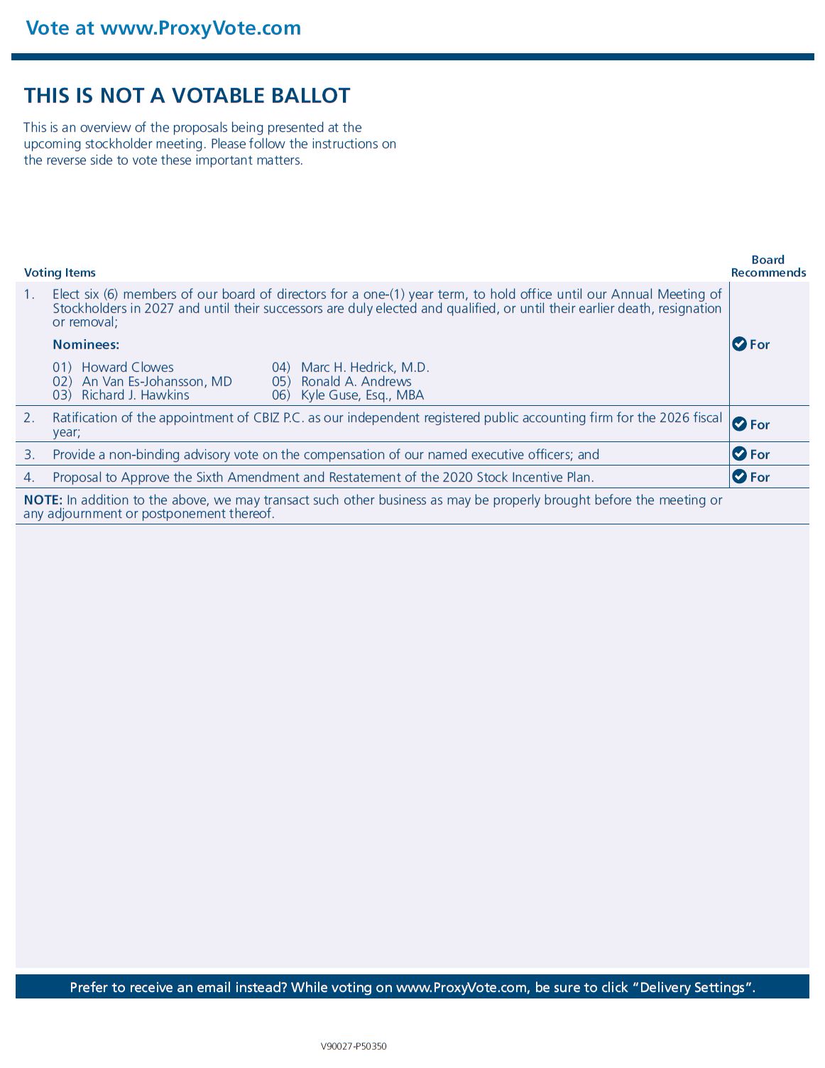“Delivery Settings”. 1. Elect six (6) members of our board of directors for a one-(1) year term, to hold office until our Annual Meeting of Stockholders in 2027 and until their successors are duly elected and qualified, or until their earlier